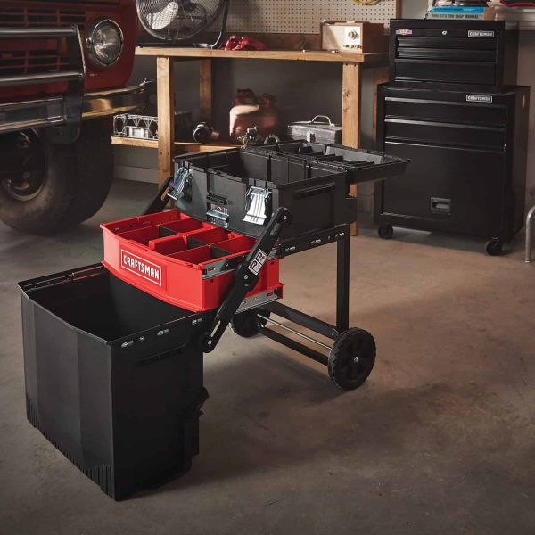 A 4-Level Workstation ideal for transporting and storing large tools, as well as organizing hand tools, accessories, and other jobsite necessities. The rolling workstation allows contractors to roll over rough jobsite terrain right up to their work area. In one seamless movement users can open and extend the workshop for visible access to four levels of storage.