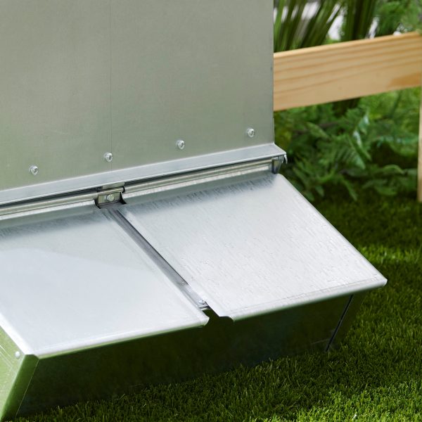 Constructed to keep feed out of the elements and pest-free, the heavy galvanized steel feeder holds up to 3.7 bushels of tasty feed. The 2-door feeder serves food for up to 8 full-grown hogs and pigs. Large, free-acting doors close automatically, wide enough to allow large hogs to eat comfortably. Each side has a feed slide that adjusts from the outside, and swing-type hinges allow cover to drop down flush with the feeder’s sides. Don’t want to wrestle through your herd of pigs while refilling the feeder? The top lid allows you to stay over the crowd and refill from your truck or tractor. Durable 20-gauge steel construction withstands even severe weather, perfect for use even in heartland thunderstorms.